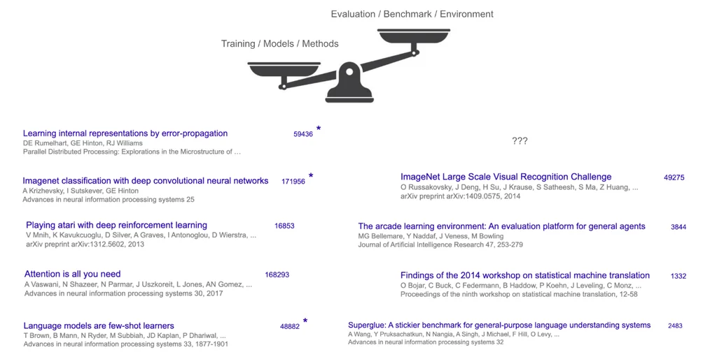 不过,有一个潜在的共性:这些“赢家”都是训练方法或模型,而非基准或任务。即便是最具影响力的基准之一 ImageNet,其引用量也还不到 AlexNet 的三分之一。在其他任何地方,方法与基准之间的对比则更为悬殊——例如,Transformer 的主要基准是 WMT'14,其研讨会报告的引用量约为 1300 次,而 Transformer 的引用量则超过了 16 万次。 !image